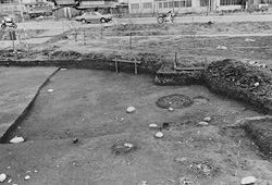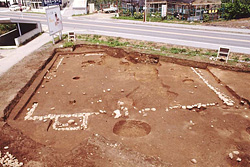 | ●内 容 | 恒川遺跡群の南側から中央部にかけての広い範囲が該当する。弥生時代以降連続して集落域として利用されており、奈良時代から平安時代も同様で竪穴住居跡が密集している。その中には、和同開珎銀銭や鉄鈴が出土した44号住居址、13×13mと大型で竪穴内に石敷きを持つ壁立建物と考えられ、特殊な遺物が多く出土した76号住居址、大型で円面硯が出土した112号住居址、富壽神寶がカマド脇から出土した2号住居址など特筆すべき住居址がある。掘立柱建物跡あるが、郡衙の建物とは想定できない。こうした状況から、郡衙が存続した時期をとおして、郡衙に関わる有力官人層の居住域と考えられる。 |