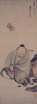 岩に肘をかけてうとうとと眠る荘子を、蓬平独特の丸顔髭面の風貌をもって描き、頭上に蝶を遊ばせている。荘子の冠帽の房は風もなく浮き上がり、夢ともうつつともおぼつかない情景を引き出している。画面全体に漂う飄々とした作風は、物語の中で示されている万物斉同の理念への接近が見える。本画題を蓬平は好み、本作をはじめいくつかの優品を残している。 |