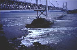 | その対岸に視線を移すと、頑強そうな橋桁が土台にしている島があった。裸島である。かつては渦潮とともに景勝の一部となっていたはずの島であるが、いまは見る影もなく大鳴門橋の一部となってしまっている。時の流れは名勝の景観をも近代的な趣に変えてしまっていたのだ。 |