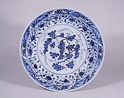 | 「青花葡萄文盤」 明代初期(15世紀前半) 景徳鎮窯 高さ7.2p 口径37.9p |