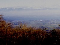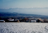 フランス国境に近いサン・セルグ行きのローカル線に乗る。標高400mのニヨンから1050mのジュラ山脈まで、高度差650mを40分かけて登る。ニヨンを出てしばらく谷の中を走ったかと思うと、すぐ展望のいい田園・果樹園地帯となる。ジュラ山麓に広がる緩い丘陵上にできた小さな村をつなぎながらしだいに高度を上げると、雪を被ったアルプスとレマン湖が見えてきた。今日も快晴。展望はすばらしい。村が途絶えると周りはやや急な斜面となり、しばらく森の中を走った後、午後2時40分ジュラ山脈の入口サン・セルグに到着する。 |