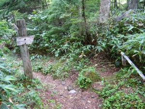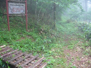 小黒川の桂木場へ下りる登山道の合流点は、馬返しと呼ばれている。ここまでくれば、道に迷うことはない。 ここには、歩いてきた道の方向を示す権兵衛峠への標識があった。しかし、2〜300mも行けば、踏み跡はササ藪に埋もれてほとんど消えてしまっている。ここから権兵衛峠まで歩くには、地形から現在地を読むことができ、ササ藪に負けない体力が必要となるだろう。 |