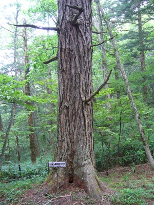 権兵衛峠から遊歩道に沿って南へ登っていくと、針葉樹と広葉樹が混じり合う、みごとな自然林が現れる。遊歩道の終点には、ひときわ大きなカラマツが現れる。林野庁によって選定された「森の巨人たち100選」の一つ、ジャンボカラマツだ。説明板によると、樹高34m、幹周4.08mとされている。巨木が単木でなく、自然林とセットで保存されているのは、とても良いと思う。 権兵衛峠からこの保存林の間は、境峠断層という活断層が北西−南東方向に走っている。権兵衛トンネルはこの断層のすぐ北側をくり抜いているが、たいへんな難工事だったという。地表においても、活断層にそった地域は崩れやすい体質をもっている。今後とも、あまり手をかけないで、この豊かな自然林を残すべきだろう。 |