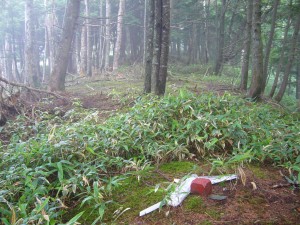 稜線には灌木の中に猛烈にササが繁っている場所と、コメツガやウラジロモミなどの針葉樹主体の自然林となっている場所がある。後者の自然林の中は光が十分差し込まないので、ササが生育できないのだろう。 ササ原と自然林がみごとな境界をなしている場所がある。こんな秩序を見せている場所でも、お互いすきあらば進入しようとせめぎ合っている場所にちがいない。時計の針を早く回して、どんな動きがあるのか見てみたいものだ。 |