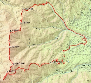 小沢川上流の北沢から権兵衛峠へ登り、稜線を南下して小黒川下降点から鳩吹林道終点まで歩いた。ここからデポしておいた自転車で、北沢の登山口までもどった。 権兵衛峠へ登る道は、2004年の台風23号の大雨で2〜3ヶ所崩れていたが、いずれも問題なく通ることができる。峠からしばらくの間は遊歩道が整備されているが、ジャンボカラマツから南は小さな踏み跡程度となり、ところどころで深いササ原を漕がなくてはならない。二重山稜や尾根が屈曲しているところでは、地図で現在地を確認しながら稜線をたどる必要がある。 |