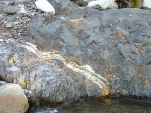 小黒川はその名の通り、黒い粘板岩からなっている。河原の石をみると、大きな石は白い花崗岩で、小さな石は黒い粘板岩であることが多い。これは、粘板岩の方が小さく砕けやすい性質があるからだ。花崗岩には、灰〜黒色の包有物が頻繁に入っている。これは、木曽駒花崗岩の特徴だ。 粘板岩には、ときどき白い石英脈が入ってくる。この石英脈は、熱水(温泉水)の通り道だったことを示す。ときどき水晶の六角柱状の結晶が見つかるかもしれない。 |