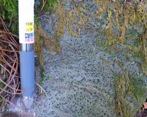 将棊頭山の山頂付近に、天水岩というテーブルのような岩塊がある。テーブルの上は平で水平だ。この岩の上に、ポットホールのような小さな窪みがある。不思議なのは、いつ見ても水をためていることだ。 窪みの形をよくみると、曲率が一定でなく、周囲が急に窪んでいて、底の方は比較的平らだ。窪みは、下の方へ拡大していくのでなく、周囲へ広がるように拡大している。 これはたぶんグナマというもので、水の凍結破砕作用によって花崗岩にできた窪みだ。水際が一番凍結融解を繰り返すので、窪みの周囲がどんどん壊されていくことになる。 |