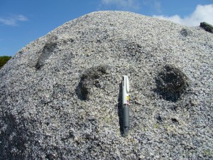 高山帯では、凍結融解などの風化作用や風雪による侵食作用が激しく起こっている。ハイマツや高山植物などを見ても、厳しい環境にうまく適応している様子をみることができる。 花崗岩地帯では、風化や侵食の厳しさは、岩石をみればよく分かる。岩石表面が厳しい凍結破砕作用で風化を受けてボロボロとなり、それを激しい侵食作用で吹き飛ばしていく。その結果、岩石表面には、風化に強いところが飛び出し、弱いところが窪むという、変化が起こる。 木曽駒花崗岩には、暗色包有物と呼ばれる、鉄に富んだマグマ由来の岩片がたくさん含まれている。これが花崗岩よりも細粒で緻密なため、風化に強く、突起をなしている。 |