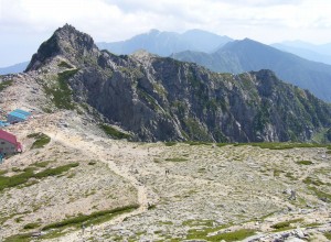 宝剣岳は、尖峰(ホルン)といえるのだろうか。尖峰は三方向からの氷食によってできる地形で、氷河が覆っていた時代でも白い氷の塊から頭を出していた大地だ。宝剣岳の場合、北側には飼駒ノ池カール、南東には千畳敷カールがある。しかし、西側にはカールの痕跡はみられず、滑川谷頭の崩壊地となっている。 宝剣岳の形をみても、氷食で削られ磨かれた面はみられない。むしろ、節理の間隔が大きかったため、侵食に抵抗して残った岩塔といった方がよいだろう。すでに節理からはがれた岩が倒れたりしている。おそらく大きな地震のたびに山頂の形は変化していくのだろう。 宝剣岳の上からは、千畳敷カールやモレーンがよく見える。中央アルプスでは典型的なカールなのに、モレーンが千畳敷ロッジによって改変されてしまったのは残念だ。 |