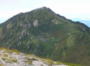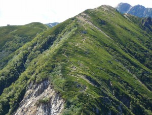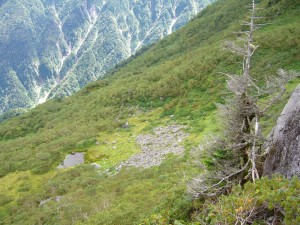 極楽平から三沢岳の間には、大小3つのカールがある。小さいけれどきれいな形をしているのが、三沢岳に近い、奥のカールだ。遠望すると、岩塔、岩塊斜面、ハイマツ林、ダケカンバ林、草地などが入り組んでいて、植生や地形が変化に富んでいることが分かる。 手前の大きなカールをみると、稜線と平行する二筋の線状凹地がある。線状凹地の部分だけ草地となっているので分かりやすい。これを南西方向へ延長すると、形の整った奥のカールへとつづく。 よくみると、奥のカールから三沢岳山頂にかけて、線状凹地をつくった正断層によって、北西方へずれ落ちているように見える。氷河がさった二万年前以降の後氷期の変化なのだろうか。 |