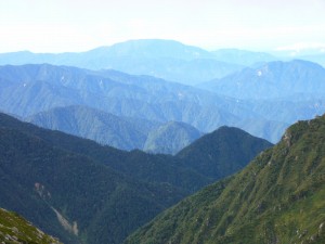 稜線から南方をみると、恵那山のどっしりした姿がみえる。その右手前には南木曽岳がけっこう大きくみえる。この2つの山塊は、清内路峠断層によって中央アルプス主部から隔てられている。そして、清内路峠断層にそって花崗岩が著しく風化し侵食されて谷地形となっているため、断層の向こうの山塊がよく見えるというわけだ。 越百山より南部をみると、尾根が清内路峠断層がつくる谷へ向かってゆっくりと下がっているのが分かる。一方、手前の越百山までの支尾根をみると、尾根の起伏が大きく、鞍部がいくつも確認できる。これらは、北東−南西方向に伸びる断層がつくった断層鞍部なのだろう。 |