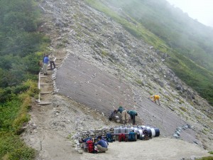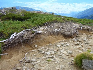 極楽平付近は登山者が多いせいか、登山道沿いの侵食がめだつ。多くの登山者が歩くことによって、土壌が削られていくとともに、踏み固められる。すると、大雨のときに、登山道が川のようになって、さらに侵食が進んでいく。掘り下げられた断面には、ハイマツの根と土壌化した風化花崗岩がむき出しとなる。 もちろん、オーバーユースを議論しなければならないだろう。しかし、その前提として、高山帯の特性をきちんと理解する必要があるように思う。 高山帯は、風化・侵食などの自然の営力が著しく大きい場所だ。地形と植生の関係は、このような厳しい場所での、長い間のせめぎ合いの結果、できあがった一種の平衡状態だ。そこに、人為的なかく乱が加わると、新しい平衡状態をつくるために、急激な変化がおこる。登山道沿いを流れる水の処理によっては、著しい崩壊を招くことだってあるだろうし、その崩壊が人里の環境を悪くすることもありうるだろう。 オーバーユースを議論すると同時に、登山道がもたらす環境変化を、もっと地道にきちんと調べて、高山帯への負荷を最小限にする技術を編み出さなくてはならない。 |