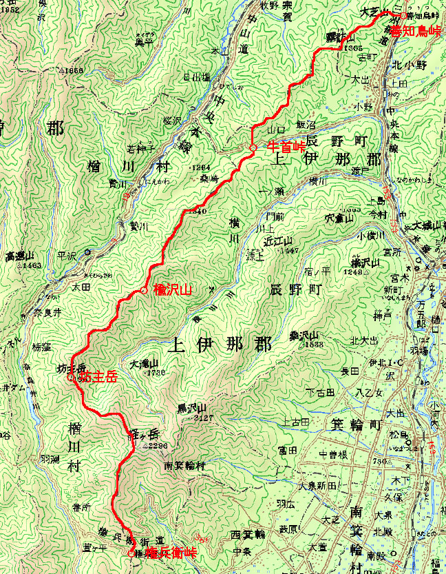 <北 部> ■善知鳥峠−牛首峠(2005.5.17) ■牛首峠−楡沢山(2005.5.25) ■楡沢山−坊主岳(2005.6.19) ■坊主岳−権兵衛峠(2005.7.24-25)