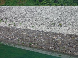奈良井ダムは巨石を積んで水圧を支えるロックフィルダムだ。一般に、ロックフィルダムは地盤の良くない場所につくられる。このダムの西方2kmのところに神谷峠がある。ちょうどこの鞍部を、神谷断層が北西−南東方向に走っている。周囲の地層(泥岩・砂岩)は、この断層に引きずられるように屈曲している。地盤が悪いのは、この地層の屈曲のせいかもしれない。 巨石を積み上げたダムの堤体をみると、下部が黒くて、上部が白い。これは上下で岩石が異なっているからだ。下部は泥岩や砂岩で、上部は花崗岩らしい。どうも、付近の岩石だけでは足りなくなったので、よそから花崗岩を運んできたらしい。 |