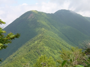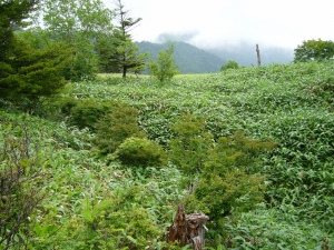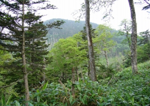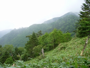 山頂のササ原はけっこう変化に富んでいる。風衝地ではササも低くなり、スゲなどの草地がパッチ状に入ってくる。また、ハイマツやレンゲツツジが混じったりしてササ一色の単純な植相ではない。7月中旬になると、ササユリがいくつも咲いていてけっこう華やかだ。 周辺にはモミやツガなどの針葉樹がまばらに生えているが、これらは今後、どう推移するのだろうか。 |