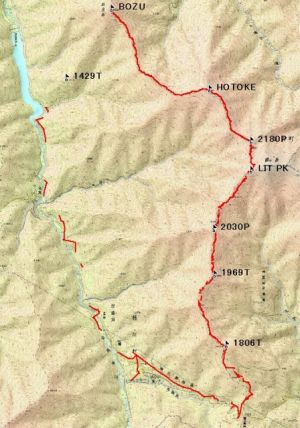 塩尻市に編入した旧楢川村の奈良井ダムから坊主岳へ登り、主稜線沿いに仏谷から経ヶ岳への分岐を経て、権兵衛峠まで歩いた。途中、権兵衛峠への稜線上で時間切れとなり、ビバークした。権兵衛峠からは、デポしておいた自転車を使って下り、登山口へもどった。 坊主岳から経ヶ岳への分岐までは、ササ藪がひどくてほとんど踏み跡さえない。とくに登りでは普段の3倍くらい時間がかかると思った方がよい。経ヶ岳分岐から権兵衛峠への尾根道は、かろうじて残っているが、ササが深いところでは道をたどることは困難である。地形図、高度計、 GPSなどで現在地をよく確認しながら歩く必要がある。 |