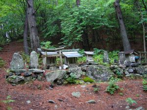 イノコ沢出合い付近に山道の入り口がある。ジグザグにしばらく登ると、石像物や小さな祠をまつった白翁神社が現れる。ここから道がはっきりしなくなるが、尾根を忠実に登っていけばよい。 しばらく登るとカラマツ植林地となり、ササがでてくる。勾配が緩やかなところほどササが深い。1500mを越えるところで尾根の向きが南北から東西へと直角に変わる。ここに南北方向の線状凹地ができている。西側の地形をみると、斜面の勾配が小刻みに変化しているので、この線状凹地から西側の部分が崩壊しはじめているのかもしれない。 |