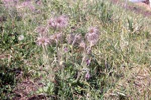 送電線の鉄塔の立つ「たきあらしの峰」までくると、北側の展望が開けて北アルプスと松本平の景観がみごとだ。大滝山の左に槍ヶ岳がわずかに顔を出している。 気がつくと、足下の石は砂岩や泥岩となっている。ここから西の稜線には石灰岩が出てこない。 1/5万地質図「塩尻」では「たきあらしの峰」の西側の鞍部に南北方向の断層が引かれている。この断層によって、東側にあった石灰岩体がとぎれてしまったわけだ。「かっとり城跡」への小道をわけ、カタクリの平をすぎると、霧訪山につく。山頂付近は伐採されているせいか、展望がすばらしい。小野の集落が扇状地の末端に広がっていることがよく分かる。八ヶ岳や南アルプス北部、北アルプス南部の山々を一つ一つ同定するのもいいだろう。木曽駒山塊や南駒山塊は経ヶ岳にかくれて、ほとんど見えない。 山頂の一角に、オキナグサを保護している草地があった。 |