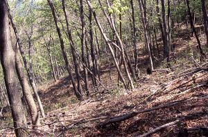 雑木林の中の急斜面を下っていくと、やせた稜線がでてくる。北東側をみると、階段状の細長い平坦地がある。これは山が解体していく際に現れる小段地形だ。山腹の侵食が進んでいくと、斜面上部が重力的に不安定となる。すると、山体内部にすべり面ができて、表層部分がすべり落ちていく。この動きが途中で止まってできたのが、小段地形だ。霧訪山の北西斜面がすり鉢状に削り取られているのは、おそらく古い崩壊地形なのだろう。 さらに進むと、稜線が細かく波打つように入り組んでいる。侵食された鞍部は、いずれも南側に寄っている。これは、北側の沢の侵食作用が卓越しているからだろう。 |