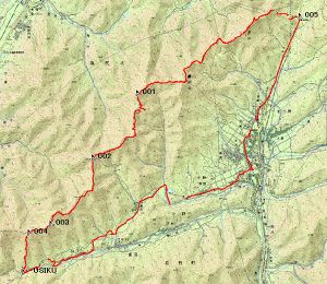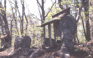 「えぼし」で尾沢峠への遊歩道と分かれる。主稜線上も作業道がしっかりついているが、 1298m三角点を過ぎてしばらく行くと、作業道がはっきりしなくなる。ここから牛首峠までは、道に迷わないように注意が必要だ。赤テープにたよるのでなく、尾根の分岐点ではしっかりと地図で確認しながら、主稜線をたどる必要がある。 稜線はほとんどアカマツや雑木林となっているが、尾沢の激しい谷頭侵食によってできたやせ尾根の部分には、砂岩が露出していて、ツガなどの針葉樹が混じっている。自然林に近いのかもしれない。牛首峠への下降点手前の 1338mのピーク付近は、北側よりも南側の侵食が激しい。稜線には線状凹地ができている。ここから生産された土砂は山麓に緩斜面をつくっていて、ここに牛首峠手前の山口集落ができている。線状凹地の南側の盛り上がりに供えられた石仏や社は、崩れと関係があるのかもしれない。 |