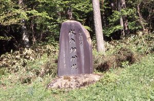 中央アルプスの北端は善知鳥峠だ。この峠は、日本海と太平洋を分ける中央分水界の一角を占めている。塩尻市が設けた分水嶺公園があり、「水のわかれ」と書かれた大きな碑がめだつ。現在 153号線が通っていて騒がしいが、かつては広い谷中分水界となっていて、気持ちの良い峠だったのだろう。普通は、峠に行政界があることが多いのだが、ここでは、北側の塩尻市が辰野側へ大きく入り込んでいる。行政界は、小野の集落のまん中をとおり、北小野は塩尻市、南小野は辰野町となっている。さらに神社まで二分され、小野神社は塩尻市、矢彦神社は辰野町という具合だ。天正 19年(1591)に、藩境争いの裁定で、集落が分断されたらしい。両小野の集落は、ちょうど霧訪山の山裾に広がる扇状地の末端に位置していて、いたるところに湧水が見られる。 |