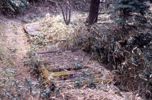富士見台の北斜面をまく道は、ほとんど水平だ。ところどころ、はしごのように丸太が横に並んでいる。これは木馬道の跡だ。伐採した木材を、木馬と呼ばれる大型のそりにつんで、この道に沿って下ろしたわけだ。 すでに丸太は腐りかけているが、それほど古そうに見えない。この付近の森を伐採したときにつくったものだろう。 |