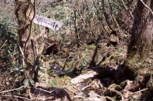 富士見台北斜面の山腹をまくようになると、横川の名水がでてくる。この名水は、園原で本谷川に合流する横川川の源流に現れたものだ。 きれいな水は、濃飛流紋岩の大きな礫のすき間から流れ出て、苔むした礫の中を流れていく。 稜線歩きをしながら、こんな名水が得られるのはたいへんうれしい。