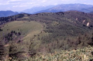 富士見台は高原状の気持ちの良いところだ。稜線付近は灌木混じりの背の低いササが茂っている。ササや樹木が大きくなれないのは、冬季の季節風が強いせいだろう。雪が風に飛ばされて、雪面から顔を出した部分が凍害で枯れてしまうからかも知れない。 東斜面では、樹林とササ原との境界線がある。温暖化がすすめば、この境界線は上昇するのだろうか。 |