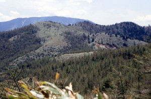 横川山には二等三角点が埋められていて、周囲の展望が大変良い。北を向くと、緩やかな南沢山と中央アルプスの山々や南木曽岳が見える。南には富士見台へつづく丸い山々と、恵那山が大きく見える。どちらも、稜線は丸くてササが生い茂り、その中を一筋の道が続いている。 周囲をみると、植林されたカラマツが大きくなれず、西風によって枝や先端が東へなびいている。冬季はけっこう風が強いのだろう。 |