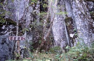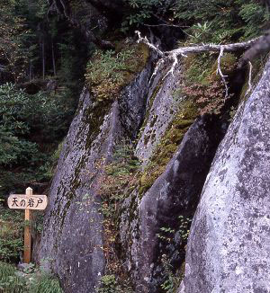 ここからは岩塊地と原生林の道を歩く。足ものにはトウヒやコメツガの球果が転がっている。六合目付近の木曽駒花崗岩には東西から東北東−西南西方向の節理が発達していて、暗色包有物も観察できる。 平坦地をすぎてやせ尾根を登っていくと、遠見場につく。ここには御料局三角点があり展望も良い。三ノ沢岳を背景にして不動明王の石像がたっている。天の岩戸をすぎると七合目につく。ここからは御嶽山や上松方面の展望がよい。 シラビソ林のきもちのよい道を登り、蕎麦粒岳や南木曽岳、恵那山方面の展望を見ながら被さった巨岩の下を歩くと、滝の水音が聞こえてくる。滑川左岸にある滝の音なのだろうか。さらに登ると、ハイマツがでてきて樹間から北股沢谷頭の崩壊地が見えてくる。崩壊地の頭からは三ノ沢岳が正面にそびえていてすばらしい。すぐに霊神碑が並ぶ平坦地がでてきて、ここが八合目だ。 |