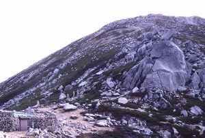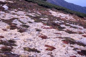 木曽前岳から玉ノ窪山荘へ下りる道沿いには、ハイマツがなくて矮小木と高山植物が茂る砂礫地がある。おそらく冬季の風が強く雪がとばされてしまうためにハイマツが生育できないのだろう。 矮小木の緑と砂礫の白がつくるモザイク状の模様が美しい。よく見ると階状土ができている。地表付近の砂礫がソリフラクションによって下方へ移動しながら、礫が分別されてできる構造土の一種だ。 玉ノ窪小屋前の石垣には九合目の石柱がある。石垣の間をとおって烏帽子岩と心明霊神の像を見ながら登っていくと、頂上木曽小屋を経て駒ヶ岳山頂に着く。山頂からは360°の展望が開け、一等三角点がある。傍らには木曽側と伊那側の二つの駒ヶ岳神社がある。 |