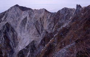 尾根の頭を巻くと格子状に割れ目が発達した不安定な岩壁とくずれおちた岩塊が現れる。地形図をみるとここは尾根の両側から侵食を受けてやせ尾根になっている。北側は幅500mほどの滑落崖となり、ここからくずれ落ちた岩塊が北股沢に段丘状の緩斜面をつくっている。南側は滑川の支流が深く谷頭侵食している。このあたりは非常に不安定な場所のように見える。 すぐに垂直の節理が発達した金懸岩と小屋が現れる。ここが五合目で、御嶽山の展望が抜群だ。金剛水という水場があるが、ほとんど水が流れていない。1984年の長野県西部地震で枯れてしまったという。地震の大きな揺れが水みちを変えてしまったのだろう。 |