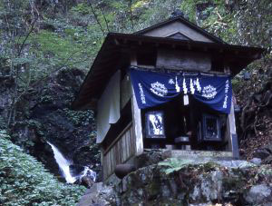 二合目から氾濫源を登ってくると、多くの霊神の碑をすぎたあたりで林道に上がる。林道の脇には、身を清める水場とともに駒ヶ岳教会の鳥居と霊場がある。霊神碑には宇気母智大御神と刻まれている。滑川にそって林道を登ると、敬神ノ滝小屋と木曽駒ヶ岳の石碑とが現れ、ここからが本格的な登山道となる。 敬神ノ滝はこぢんまりとした滝で、霊神碑や祠がたっている。かつて多くの信者がここで身を清めて駒ヶ岳登山を行った。最近は信者が高齢化したために登山する人が少なくなったという。 |
