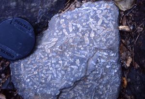 土壌の中から現れた花崗岩の巨礫や木の根を越えながら暗い植林地の中を登っていく。このあたりの地質は泥岩もしくは泥岩が熱変成したホルンフェルスなので、花崗岩礫は上流から運ばれてきたものだろう。三合目をすぎると大きなヒノキやブナが茂る自然林となり、足下に転がる石はホルンフェルスになる。黒いホルンフェルスには白っぽい長柱状の鉱物がめだつ。おそらく白雲母に変質した紅柱石の仮晶なのだろう。 四合目付近までくると表面が白〜茶色の珪長質火山岩や灰〜黒色の閃緑斑岩が現れる。これらはホルンフェルス中に地下から上ってきた貫入岩だ。 1720m付近で登山道沿いの土壌の色が明るい茶色になってくる。同時に木曽駒花崗岩の転石が現れるようになり、地質が花崗岩へ移り変わったことが分かる。 |