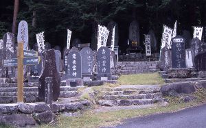 アルプス山荘前に二合目の石柱と道標があり、ここが登山道入口となっている。背後にはたくさんの心明霊神の碑が並んでいる。ここは犬山乾山講社の霊場で、八十八夜には春の祈りが捧げられるという。 2kmほど手前(西)の上松町徳原地区の駒ヶ岳神社里宮では、毎年5月3日に太々神楽が奉納される。白い天狗の面をつけた踊り手が宙に舞う姿が迫力満点らしい。この神楽は400年以上にわたって続けられていて国の選択無形文化財に指定されている。初夏の駒ヶ岳開山式の際にも奉納されるという。この里宮が1合目になっている。 |