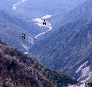 このルートは1891(明治24)年にウェストンが歩いた道だ。ウェストンは早朝に上松を出発し、駒ヶ岳山頂を経て1日で伊那まで歩いてしまったという。山麓の駒ヶ岳神社里宮をはじめ登山道沿いには多くの石碑があり、古くからの信仰の道だったようだ。 このルートは滑川とその支流北股沢とに挟まれた尾根にある。この二つの沢は激しく谷頭侵食しており、土石流を頻繁にだす河川だ。多治見砂防国道事務所では土石流のビデオ映像が撮られており、インターネットで公開されている。 ここでは数多くの石碑や地名から歴史や信仰を感じることができるとともに、荒々しい北股沢の崩壊地やその堆積地形を観察することができる。 |