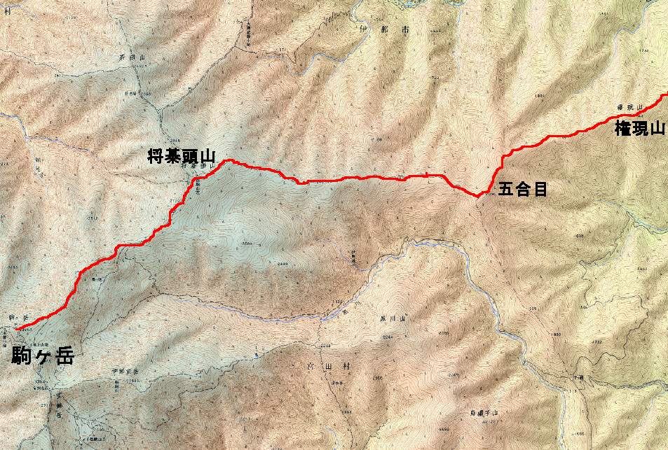 このコースは地元の方々によって最近になって整備されたが、実は江戸中期に高遠藩の検分登山の際にすでに歩かれている歴史の道だ。上松から駒ヶ岳へ登ったウェストンもこの道を下ったらしい。現在では、登山地図にも掲載されている。 五合目付近までは問題ないが、ここから八丁立の三等三角点までの尾根がところどころ迷いやすく、急坂となって歩きづらいところがある。「つるね」とは尾根を意味する。 地質は主に東側半分が黒っぽい変成岩(黒雲母片岩)で、西側の主稜線側が木曽駒花崗岩となる。この岩相境界は、2250m付近の傾斜の変換点にある。権現山と五合目の間には花崗岩が分布する個所がある。 |