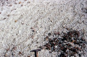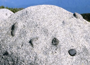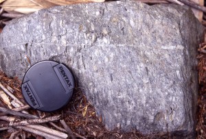 権現山と五合目の間には、太田切花崗岩が分布する。太田切花崗岩は、白雲母を含んでいる細粒の白っぽい花崗岩で、ザクロ石を伴うことがある。 この花崗岩の周囲には、黒雲母片岩でなく砂質片岩がときどき分布している。砂質片岩の中の、礫質な部分を見てみると、礫が細長くラグビーボール状に伸びているのが分かる。地下の高い温度と圧力の中で、飴のように変形したわけだ。 |