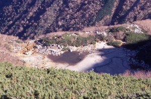 8合目をすぎると、濃ヶ池カールで侵食されてやせ尾根となった馬ノ背にでる。ここからは、黒川の氷食谷(U字谷)やカールの底にたまった濃ヶ池やモレーンを観察できる。これらは、すべて氷河時代からの贈り物で、7〜2万年前にできた地形を見ているわけだ。もちろん、当時は氷河におおわれていて、カールには白く輝く氷河がおおい、森林限界は1000m以上も下がっていたはずだ。 濃ヶ池はカール壁から流れてくる土砂の埋積で小さくなっているとされていたが、最近、排水口の侵食によって急激に水位が下がっていることが確認された。これは人の踏みつけによるものらしい。 |