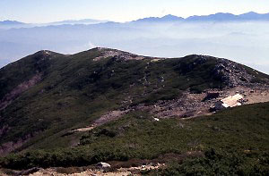 将棊頭山へ登れば、御嶽山から駒ヶ岳、南アルプスと、360°の展望が得られる。 登ってきた尾根を振り返ると、将棊の頭までの尾根がゾウの背中のようにどっしり見えている。その向こうには南アルプス北部の山々と八ヶ岳の間に、奥秩父の山々がみえる。 |