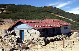 将棊頭山を背景に、赤い屋根の西駒山荘が現れる。南西側には石を屋根の位置まで積み重ねて、強風対策をしている。 この西駒山荘は、中箕輪尋常高等小学校の大量遭難事件をきっかけに、1915年に地元の手でつくられたらしい。その後、伊那市の運営に代わっている。 |