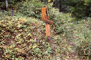 雨乞いや高遠藩の検分登山でも利用された歴史の道だが、伊勢湾台風で荒れ、その後ロープウェイの設置で登山者も少なくなって、自然に廃道になっていたという。これを地元の方々がササを刈ったり倒木を除去したり、道標を整備するなどして、復活させた。 登山道入口には歴史の道であることを記した標識があり、途中の道沿いにも、競馬場跡、伊那高女学校林などの標識がある。地元の人たちの歴史や自然を大切にする気持ちが伝わってくる。 |