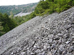 登山口のある木曽駒高原スキー場は山麓から広がる広々とした緩斜面だ。この緩斜面は、赤林山付近から崩れてきた岩屑が周氷河作用によってならされてできた麓屑面なのだろう。足下の転石をみると、ときどき白っぽい花崗岩が見られるがほとんど黒っぽい変成岩だ。この変成岩は赤林山をつくっている岩石だ。 正沢川の谷を左に見て幸ノ沢を登っていく。ときどき花崗岩の丸い巨礫が斜面に見られるが、これらは上流から土石流で運ばれてきたものだ。河床や斜面を削ったところでは黒っぽい変成岩が見られる。 堰堤で川を渡って変成岩の斜面を登っていくと、四合目で背後の展望が得られる。ここからは、木曽駒高原スキー場の緩斜面や乗鞍岳方面の木曽谷が見える。 |
