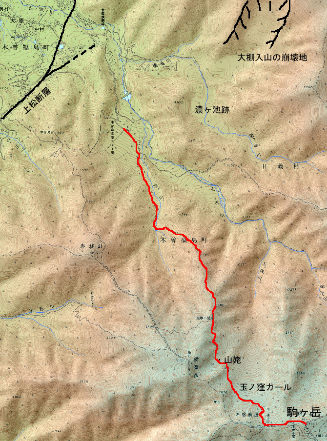 駒ヶ岳に登るには尾根をずっとたどることが多い中で、このルートは途中から山腹を巻く変化に富んだコースだ。付近には地震で崩壊した大棚入山と天然ダムの痕跡、上松断層の変位地形などが観察できる。 登山道沿いでは茶臼山から駒ヶ岳の稜線がよく展望できる。地質は変成岩から木曽駒花崗岩へ移るのみで面白みに欠けるが、カールなどの氷河・周氷河地形はたいへん興味深い。とくに節理の発達した花崗岩の岩壁や山姥のような巨大な岩塊地は、他ではなかなか味わうことができないダイナミックなものだ。 ここではルート沿いだけでなく、周辺の不思議な地形を含めて紹介しよう。 |
