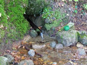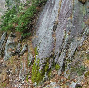 古い切り株のある自然林を登っていくと、砂質片岩の巨石がゴロゴロするようになり、急に花崗岩ばかりとなる。変成岩から花崗岩分布域に変わったわけだ。 花崗岩の巨石が岩小屋のようになっている場所をすぎると四合半の力水につく。力水は、花崗岩の割れ目から湧く冷たくておいしい水だ。周囲にはトウヒやシラビソ、コメツガが茂っている。この自然の森がおいしい水を育んでいる。 |