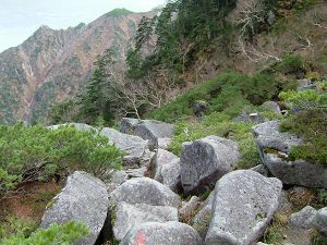 麦草岳の東を巻いていくと、花崗岩の岩場から湧く水場がある。ここから玉ノ窪カールまでは展望もよく、岩場や岩塊地など変化に富んでいて面白いところだ。 とくに面白いのは山姥と名づけられた巨大な岩塊地だ。カールの末端付近に直径5m以上の花崗岩の巨石がゴロゴロしている。とくに先端付近により大きな巨石があってすき間が空いていて苔むしている。大きなすき間は岩小屋として利用できそうだ。上流側は巨石とハイマツとのコントラストが美しい。カール壁の花崗岩には垂直な節理が発達している。 ところでこの岩塊はどのようにしてできたのだろう。氷河の侵食によって堆積したモレーンならもっと細かい砕屑物がないとおかしい。不淘汰な砂礫は岩塊地西側に分布しているので、これがモレーンなのかもしれない。モレーンの上に岩石氷河として運ばれてきた巨礫が覆っているのかも知れない。 ここからは大棚入山もよくみえる。大棚入山の滑落崖は、一部植生がなくて岩塊斜面になっている。 |