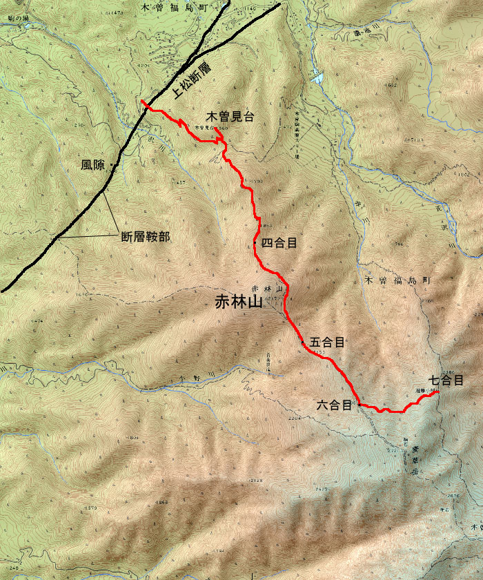 このルートは長くて単調な尾根道なため、下山に利用することの多いコースだ。 六合目から麦草岳に登って玉ノ窪小屋にでることもできるが、一般には七合目の避難小屋方面への巻き道をたどり、福島Bルートに合流して山頂をめざす。ここでは上松断層の地形変換線を出発して、避難小屋のある七合目までの道を紹介しよう。 上松断層のつくる地形や変成度の弱いさまざまな岩石、花崗岩との境界を探ってみよう。崩れる準備段階の線状凹地も観察できる。 |