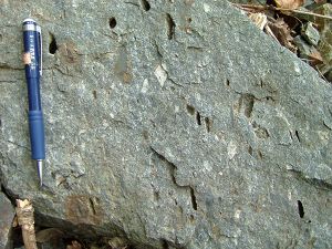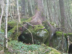 花崗岩は節理に沿って割れやすいため岩塊が生産されやすい。そのため花崗岩地帯にはいると急に岩塊が目立つようになる。岩塊地は崩壊地やカール壁の下方にできやすい。尾根部では岩塔周辺などでできる。ここの岩塊地の場合、上方に崩壊地や岩塔などは見られないが、その代わりに線状凹地が見られる。岩塊を生産した岩塔などはすでに谷へ崩れ去ってしまったのかもしれない。岩塊は亜高山帯針葉樹の原生林に覆われていて、しっかりと根で固められている。岩塊地はおそらく植生のなかった氷期に形成されたものだろう。 木曽駒花崗岩特有の暗色包有物は表面から飛び出したり、分離して転がったりしている。これは花崗岩よりも侵食に強いためだ。 六合目で麦草岳へ直登するルートと別れ、七合目の避難小屋方面へ行く巻き道をたどる。谷筋は巨礫が埋めているが、水場が2ヶ所ある。 |