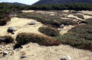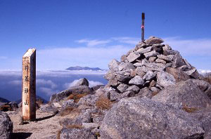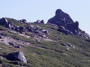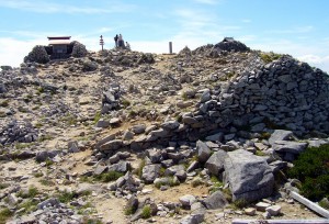 木曽駒ヶ岳山頂には一等三角点が設置されていて、北アルプスから八ヶ岳、南アルプスなど360°の展望が得られる。付近には伊那と木曽の二つの駒ヶ岳神社の奥ノ院が祀られている。また、石組みの跡もあって、かつては宿坊のような建物が山頂にもあったのかも知れない。 山頂部は大小の花崗岩礫がゴロゴロしている砂礫地で、広い緩傾斜地となっている。これは人為的な植生破壊も関係しているのだろう。 |