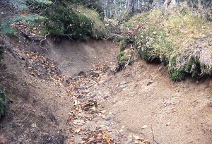 土壌が凍結融解作用を受けると、地表に奇妙な模様ができる。緩やかな斜面が階段のようになる階状土もその一つだ。 階状土は、凍結した土壌が融解するときに、地表付近の水分をたっぷり含んだ土壌が、その下の凍結層から離れて斜面下方へずるずるとすべっていく現象だ。緩やかな斜面では階状土になり、傾斜が強くなると、ソリフラクションローブになるらしい。階状土は移動する土壌の末端が、矮小木の植生によって動きを止められている。 登山道の下にある階状土では、登山道から流れ出る表流水によって侵食されたり、マサが堆積したりして、改変しているように見える。 |